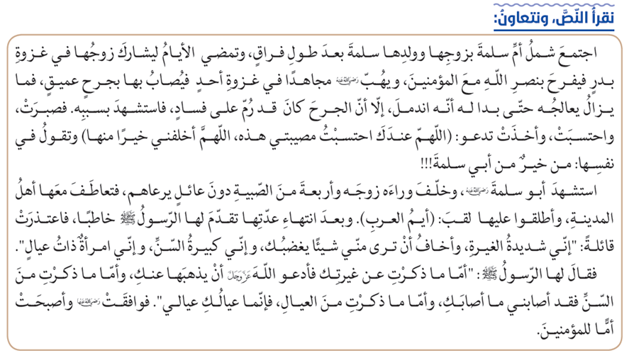 حل درس ام سلمة رضي الله عنها في مادة التربية الاسلامية للصف الحادي عشر من الفصل الدراسي الثاني ، مع الاجابة علي جميع الاسئلة.