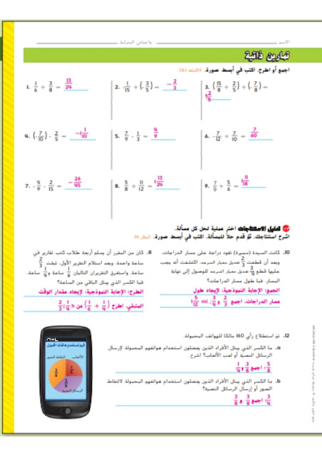 نوفر لطلابنا الأعزاء حل درس جمع الكسور غير المتشابهة وطرحها في الرياضيات للصف السابع في شرح مفصل ومفاهيم شاملة لهذا الدرس ، الذي يحتوي علي 8 صفحات من مسائل من الحياة اليومية ، والمفهوم الرئيسي مع تدريبات لمختلف التمارين التي تهدف الي زيادة في فهم هذا الدرس.