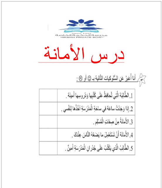 الي هنا وصلنا الي بداية الاطلاع علي صفحة ورقة عمل درس الأمانة من مادة التربية الاسلامية للصف الثاني .
